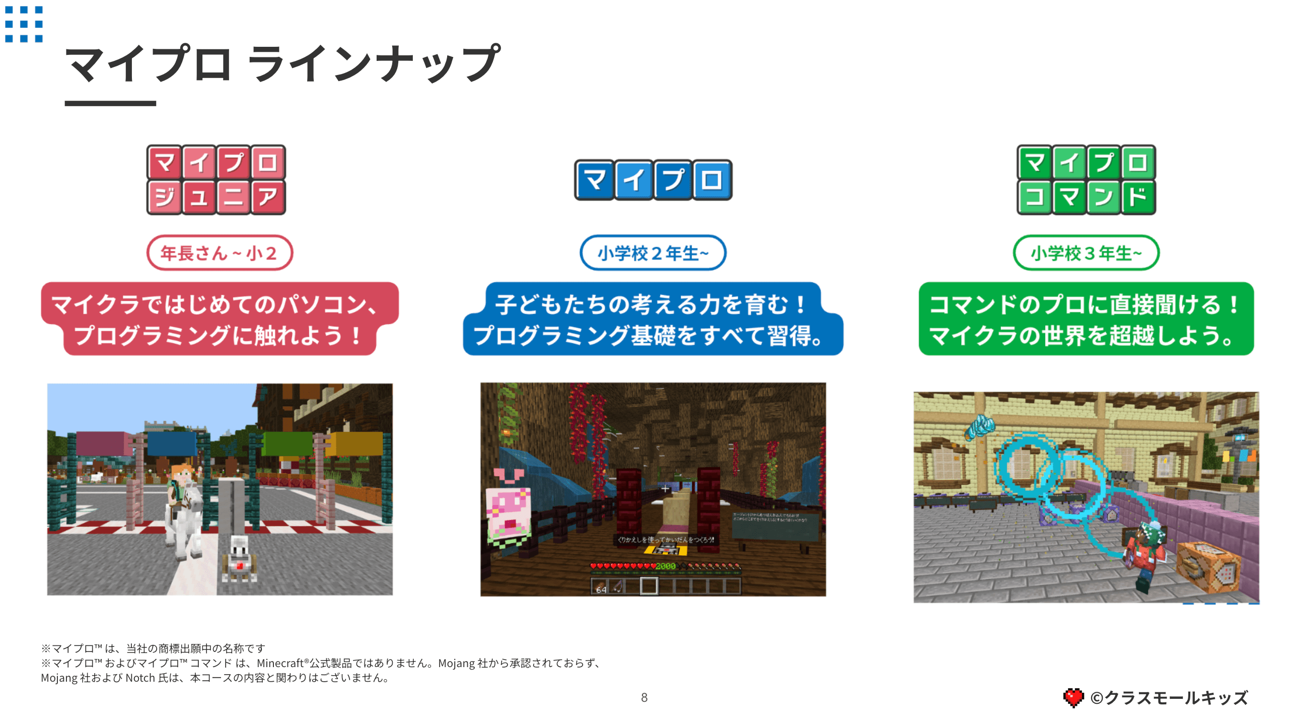 その中でも、教育版マインクラフトでプログラミングが学べる教材「マイプロ™」は、継続率90%以上の人気コース。
